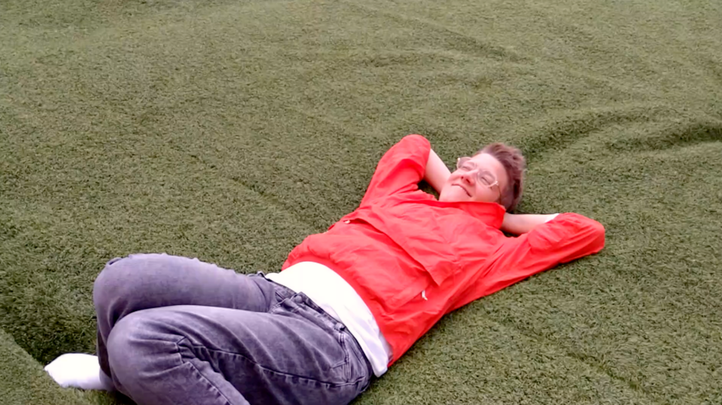 After several loops, the video switches to a slow-motion shot of my friend Lia lying on a huge artificial turf waterbed and being gently rocked as unknown children tumble around her, outside of the frame. She was four months pregnant at the time, had hardly slept the night before and had severe back pain. This image condenses different assumptions and attributions with regard to the female body, gendered work, love, the nuclear family, reproductive work, the private and the public.