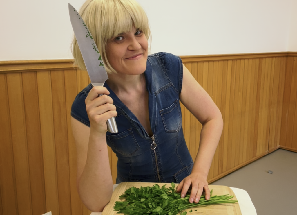 A performative, analog loop revolves around the opposing verbs “to hustle” (to be industrious, to hurry, to attain something illegally, to do sex work) and “to idle” (to laze around, to be unproductive). In a denim one-piece with a blonde wig, I slip into all the characters of a 90s sitcom opening credits, right down to the dog, for each rotation with just a few props. Various collective visual memories, film language conventions and personal, idiosyncratic longings and attributions overlap in the process.